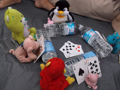 Mr. Penguin Jr. insisted on one game of Big 2 before they all turned in. A makeshift table was quickly made out of water bottles.